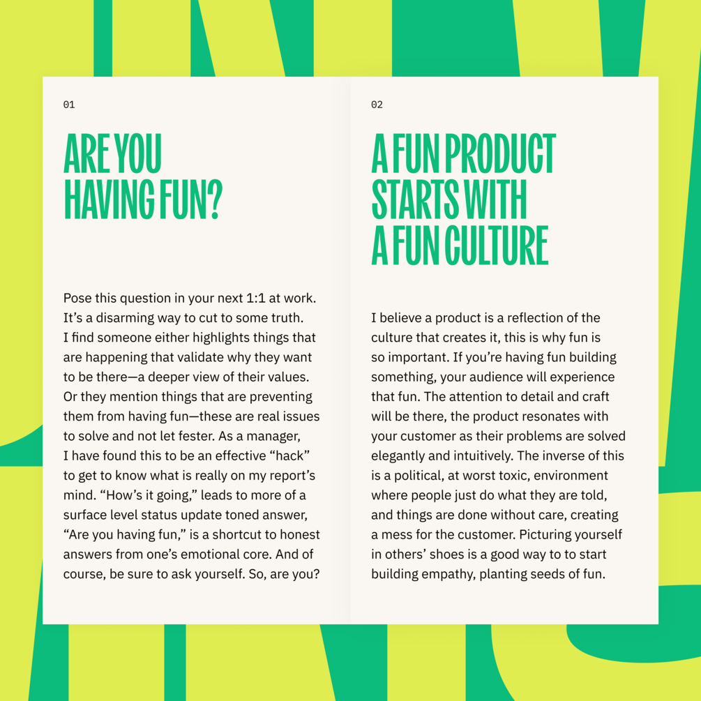 This pocket book compiles thoughts and experiences of 20+ years of what’s worked for me building products in the tech space, filtered through having fun at the foreground of my mind the last few years.